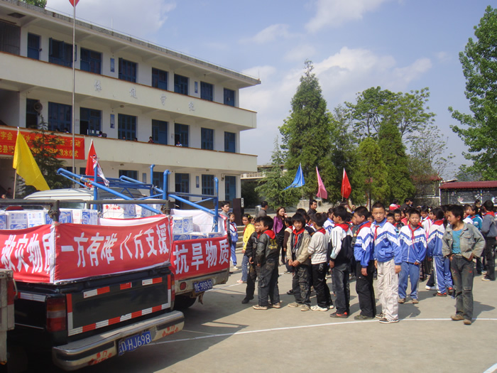 4月19日,由浙江永康群喜门业有限公司捐赠价值7000元的500件 1.2万瓶“快乐王子”牌矿泉水,“搭”着五辆小型运输车从我州兴义市启程,“奔赴”大旱灾区的安龙县兴隆镇巧凹小学,“滋润”着学生的心田。