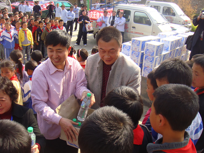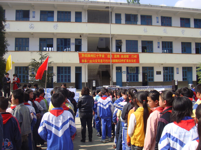 在捐赠现场笔者了解到,浙江永康群喜门业有限公司的这次捐赠,是由家住安龙县龙广镇农民工何仕红和我州红十字会“牵”的“线”。今年4月中旬,现在身份为浙江永康群喜门业有限公司黔西南州总代理的何仕红,从新闻媒体了解到我州遭到百年不遇旱情,旱区群众饮水十分困难后,及时向公司经理汇报并建议公司开展捐赠活动,以尽企业的一份社会责任。公司经理单泽喜立即委托何仕红向我州红十字会明确表示捐赠的意向,州红十字会通过安龙县红十会的联系,决定把布依族聚居山区且学生饮水十分困难的巧凹小学确定为该公司的捐赠对象。4月19日这天,浙江永康群喜门业有限公司出资7000元购置了矿泉水并请车辆运送到了巧凹小学,缓解了该校340名学生的饮水困难。